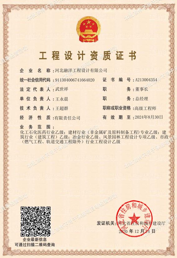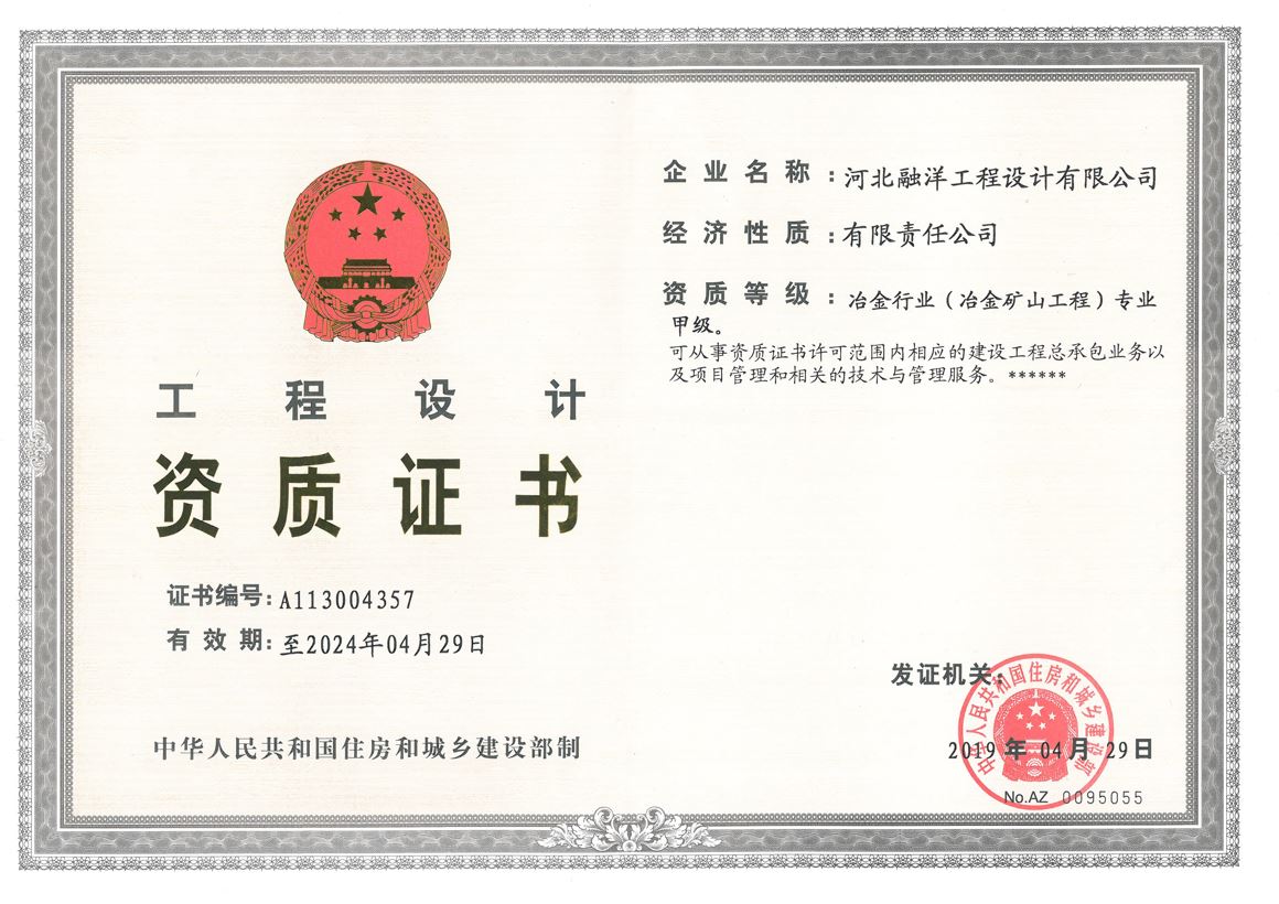 河北融洋工程設(shè)計有限公司成立于2009年,注冊資金1500萬元,擁有住房與城鄉(xiāng)建設(shè)部審批的冶金礦山工程甲級設(shè)計資質(zhì),公司還具有冶金行業(yè)、化工石化醫(yī)藥行業(yè)、建筑行業(yè)、建材行業(yè)(非金屬礦及原料制備工程)設(shè)計乙級資質(zhì),并可從事資質(zhì)范圍內(nèi)相應(yīng)的總承包業(yè)務(wù),以及項目管理和技術(shù)咨詢服務(wù)。