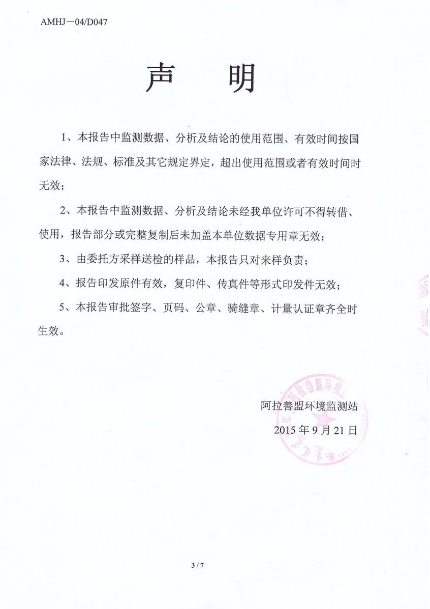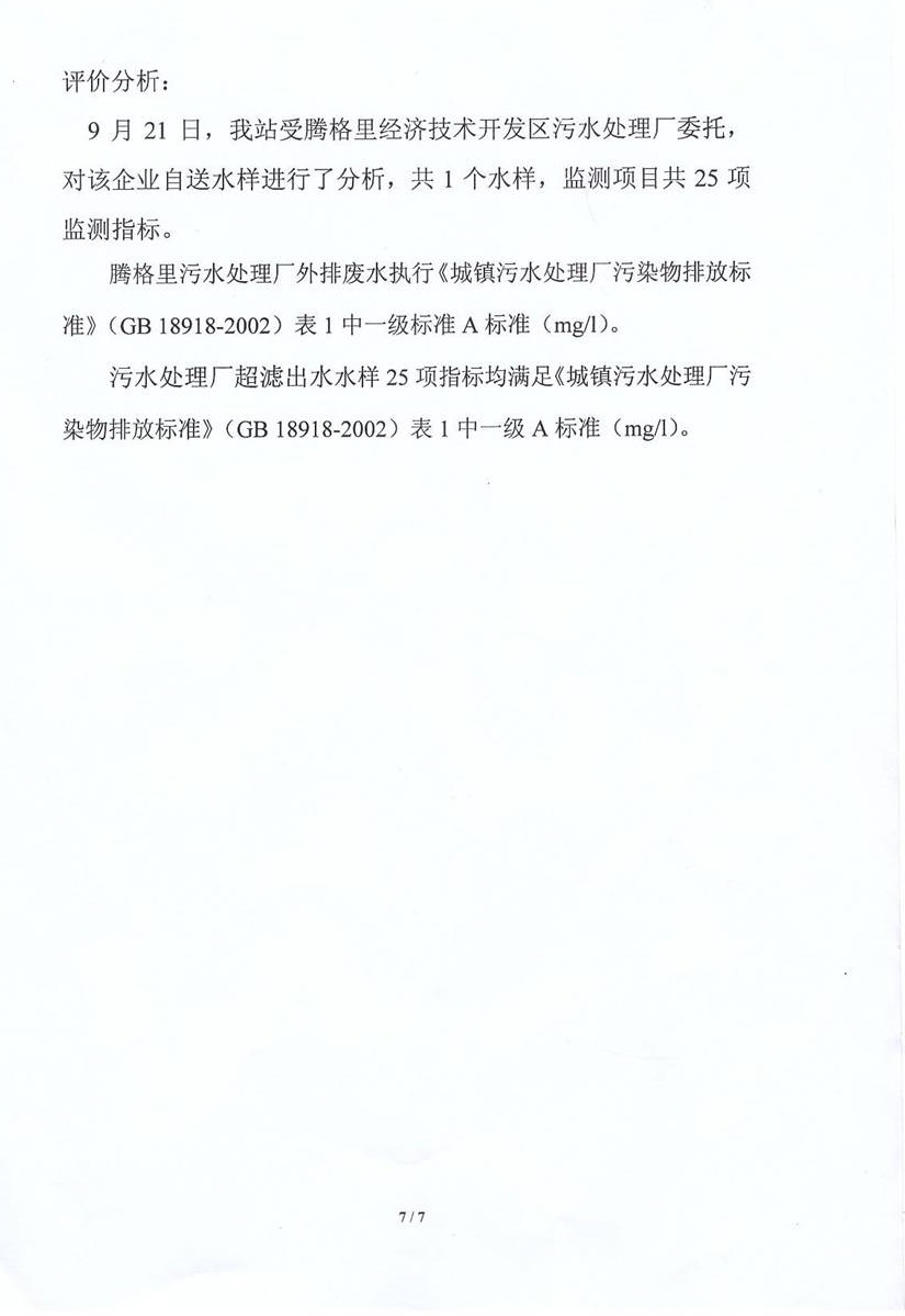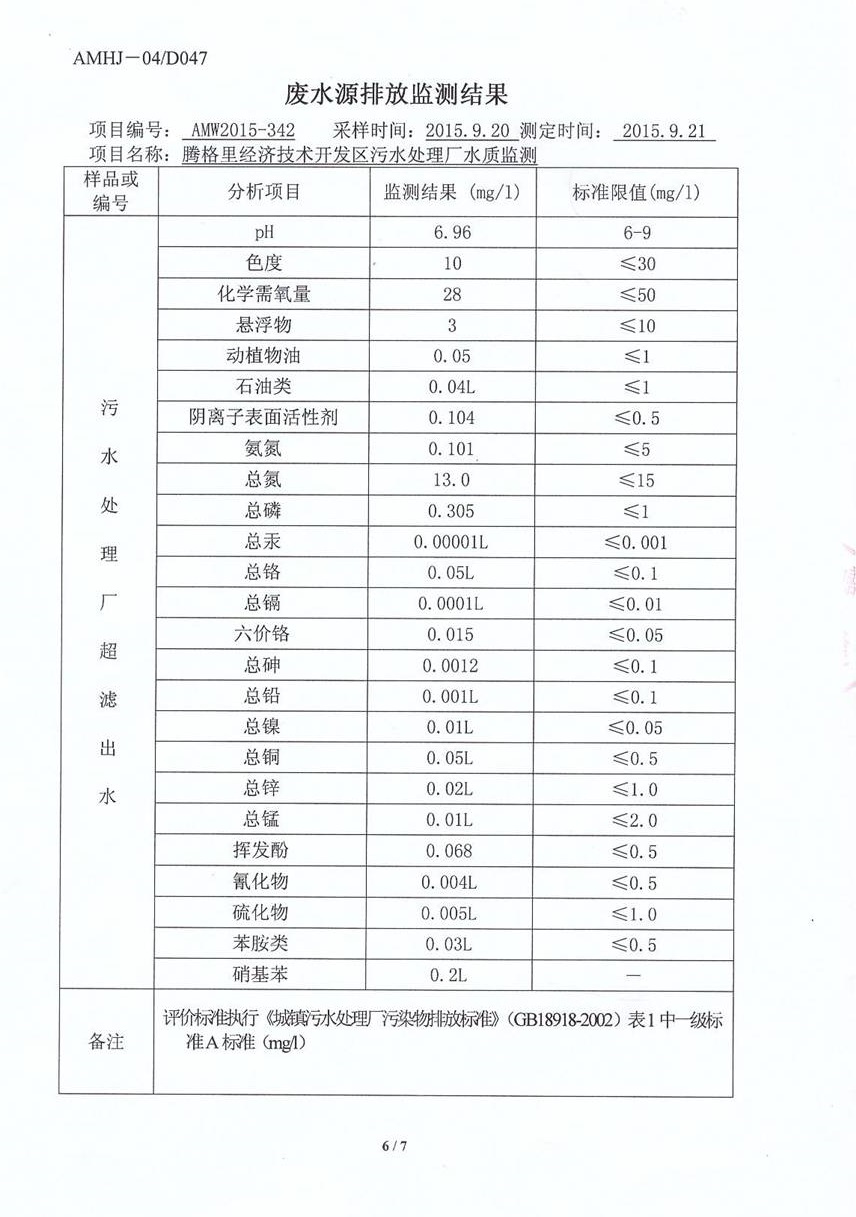 2015年9月21日,受騰格里經(jīng)濟(jì)技術(shù)開發(fā)區(qū)污水處理廠委托,阿拉善盟環(huán)境監(jiān)測站對園區(qū)內(nèi)水廠出水水樣進(jìn)行分析,出具水質(zhì)監(jiān)測報告,報告顯示,騰格里污水處理廠外排廢水執(zhí)行《城鎮(zhèn)污水處理廠污染物排放標(biāo)準(zhǔn)》(GB18918-2002)表1中一級標(biāo)準(zhǔn)A標(biāo)準(zhǔn)(mg/l)。污水處理廠超濾出水水樣25項(xiàng)指標(biāo)均滿足《城鎮(zhèn)污水處理廠污染物排放標(biāo)準(zhǔn)》(GB18918-2002)表1中一級標(biāo)準(zhǔn)A標(biāo)準(zhǔn)(mg/l)。