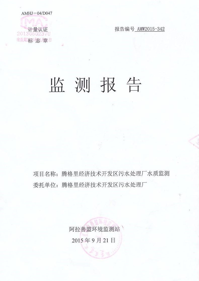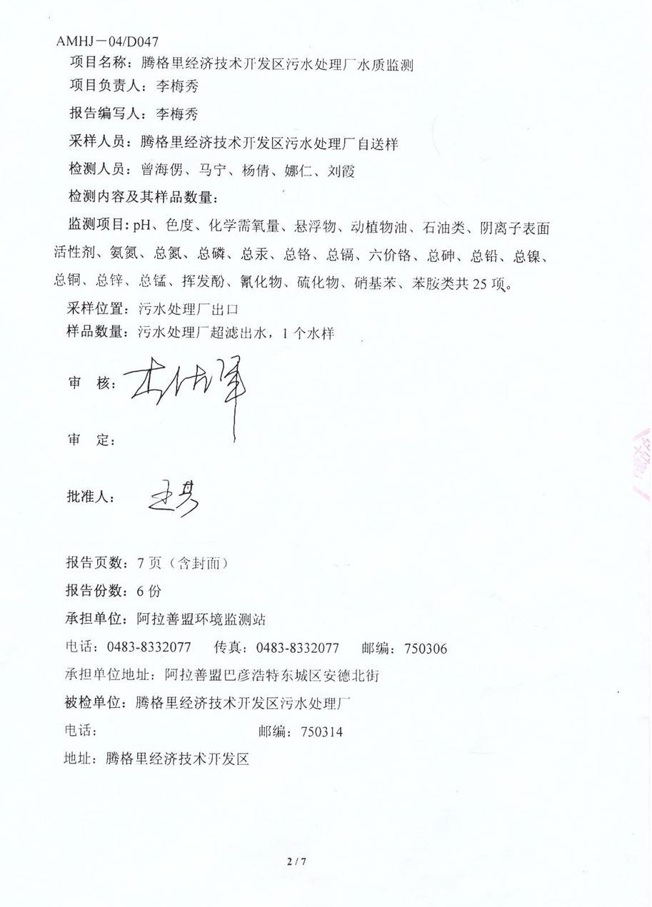 2015年9月21日,受騰格里經(jīng)濟(jì)技術(shù)開發(fā)區(qū)污水處理廠委托,阿拉善盟環(huán)境監(jiān)測站對園區(qū)內(nèi)水廠出水水樣進(jìn)行分析,出具水質(zhì)監(jiān)測報告,報告顯示,騰格里污水處理廠外排廢水執(zhí)行《城鎮(zhèn)污水處理廠污染物排放標(biāo)準(zhǔn)》(GB18918-2002)表1中一級標(biāo)準(zhǔn)A標(biāo)準(zhǔn)(mg/l)。污水處理廠超濾出水水樣25項(xiàng)指標(biāo)均滿足《城鎮(zhèn)污水處理廠污染物排放標(biāo)準(zhǔn)》(GB18918-2002)表1中一級標(biāo)準(zhǔn)A標(biāo)準(zhǔn)(mg/l)。